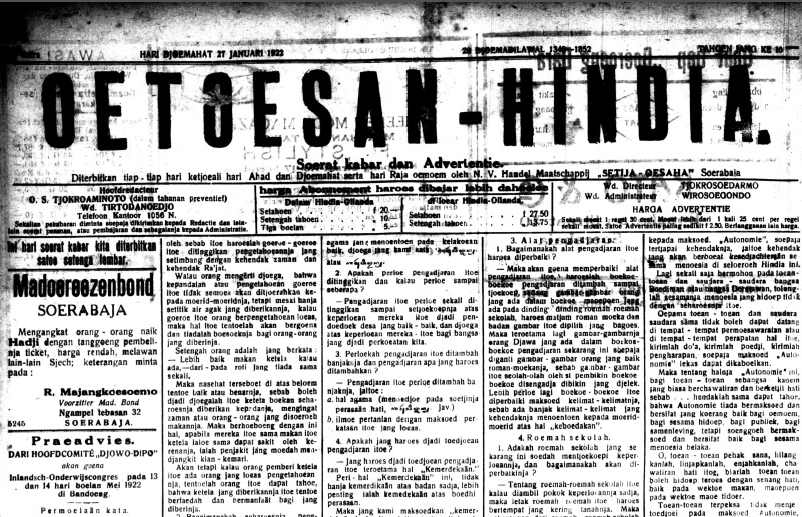 Oetoesan Hindia adalah surat kabar yang terkenal sebagai organ dari Sjarikat Islam (SI) (Ricklefs 2008: 390). Awalnya surat kabar ini didirikan untuk mengakomodir kebutuhan akan informasi dan periklanan bagi pedagang Arab dan bumiputra di Surabaya. Penerbitannya tidak terlepas dari keikutsertaan Hasan Ali Soerati, perusahaan NV Handel Maatschkappij Setija Oesaha Soerabaia, dan gabungan pengusaha Arab dan Bumiputra Surabaya, Semarang, Pekalongan, Batavia, dan Bandung. Nomor percontohan Oetoesan Hindia terbit pertama kali Desember 1912 (Rahzen 2006: 83). Sementara surat kabarnya secara resmi baru mulai terbit pada 1 Januari 1913 (Adam 2003: 267).